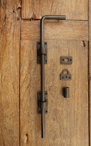 A solid textured bronze cane bolt for gates & doors. Built in pin to keep cane bolt from being taken out of the holders and also allows for the cane bolt to be propped in the upward position as shown in the picture.