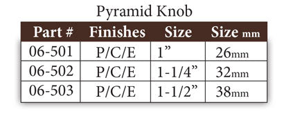Available in three exquisite natural finishes it complements a range of interior decor styles. Designed for seamless installation, this knob is crafted with precision and durability in mind. Enhance the beauty of your cabinets with the Pyramid Knob, a sophisticated and versatile choice that adds a touch of timeless elegance to any room.