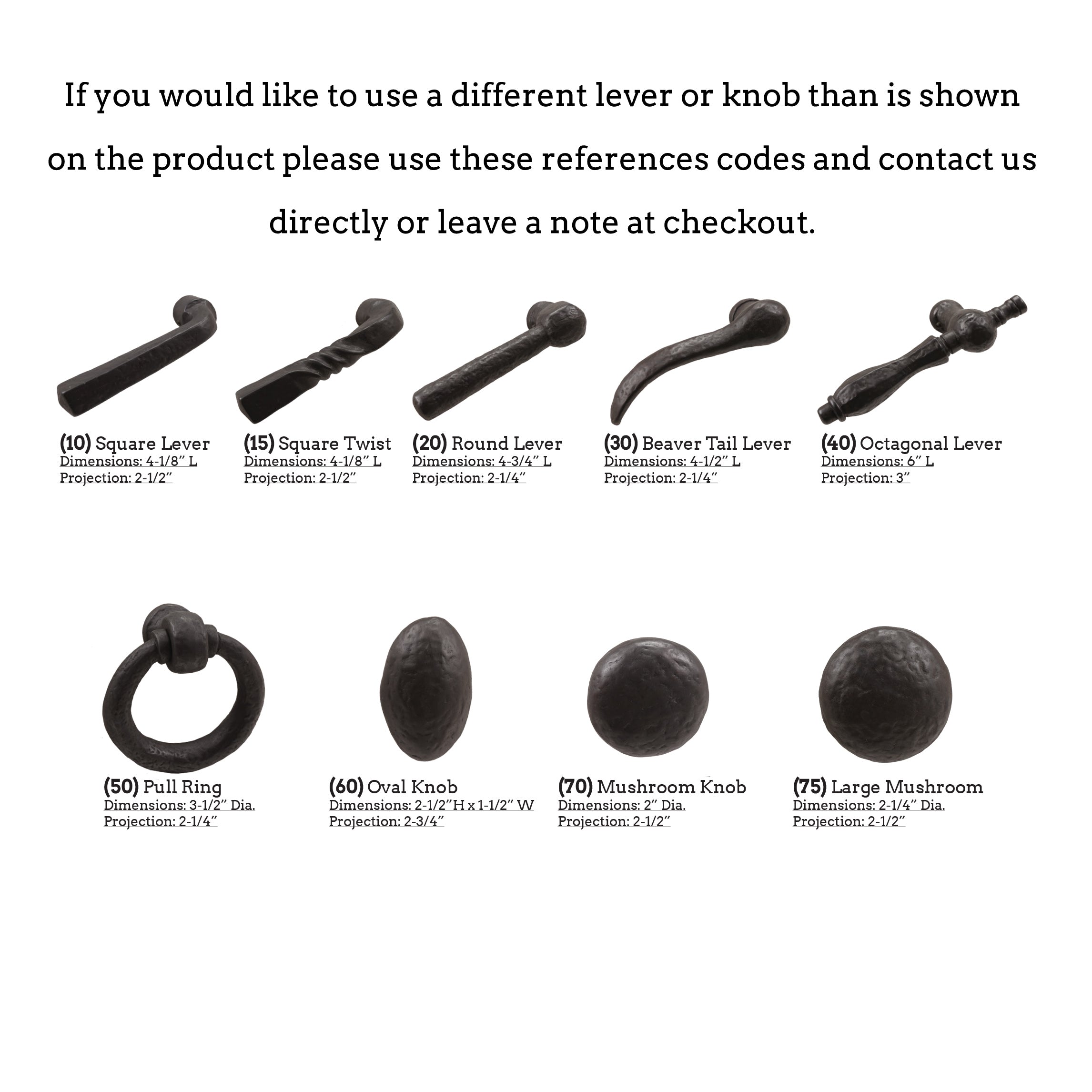 We will contact you after ordering to confirm gate thickness, handing, and strike type. If you would like a different lever or knob then is shown please contact us or leave a note at checkout.